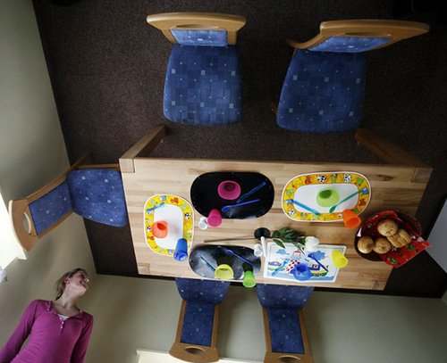 当 地木匠杰哈德·莫德斯特和他的朋友吉塞斯·斯利特斯托博、曼弗雷德·克莱克斯一起建造了这栋奇异房屋。他们称这项工作是最令人疯狂的,浴室部分是最难设计 的,因为里面有淋浴等大件设施。他们总共在天花板上固定了50多件物品,包括床、桌子、微波炉和照片。最重的家具是重达50公斤的衣橱,上面还有一面镜 子。