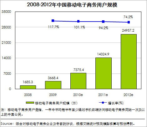 艾瑞咨询预计,2010年移动电子商务用户规模将进一步扩大,达到7375.4万,而到2012年,中国移动电子商务市场用户规模将达到24957.2万。